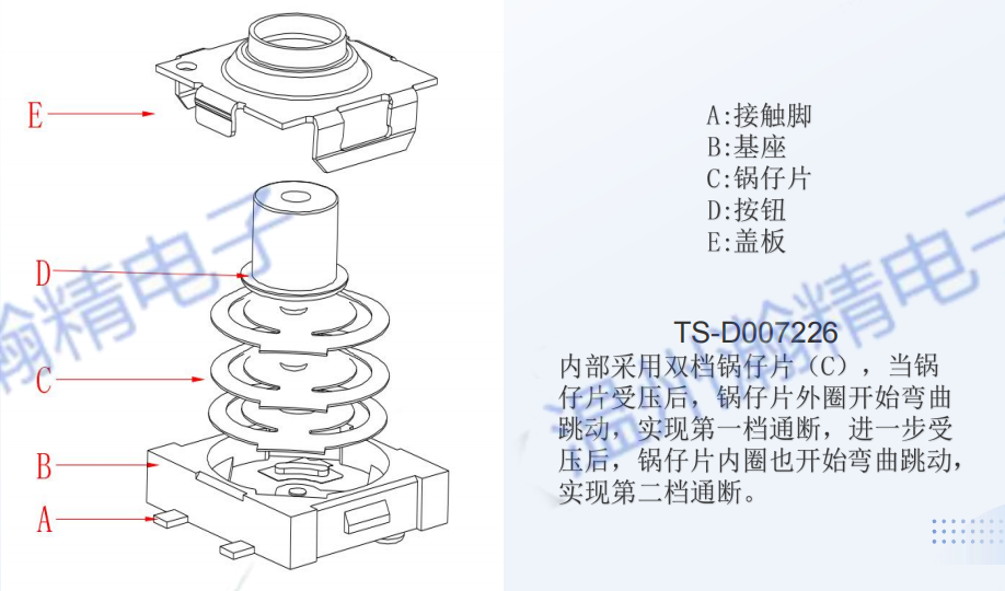 两档开关内部采用双档锅仔片(C),当锅仔片受压后,锅仔片外圈开始弯曲跳动,实现[敏感词]档通断,进一步受压后,锅仔片内圈也开始弯曲跳动,实现第二档通断。