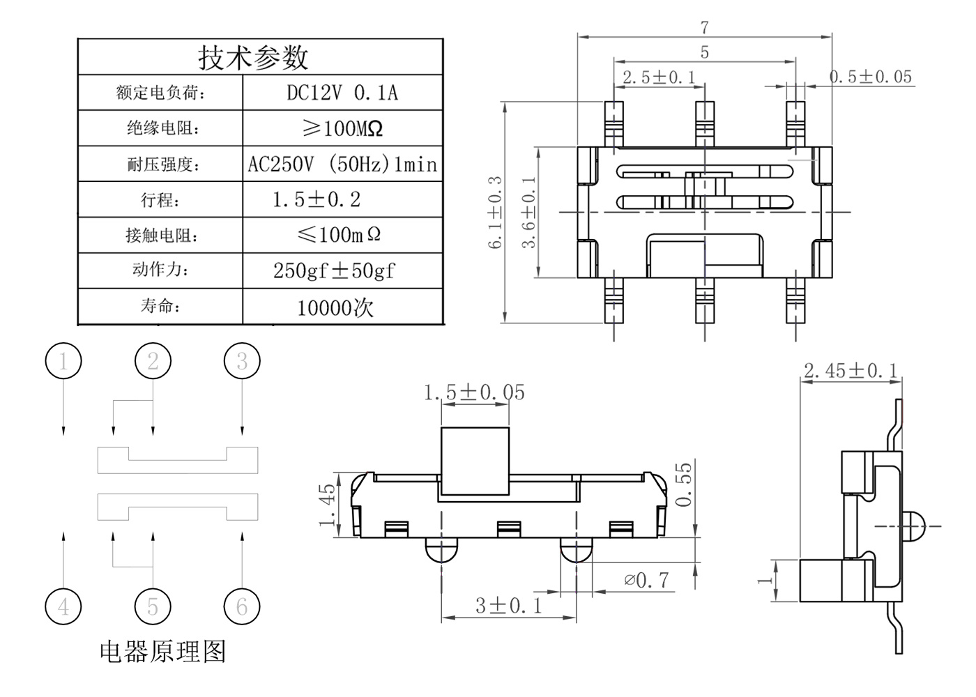 特点:滑块动作灵活,性能稳定可靠。开关采用16mm宽编带包装